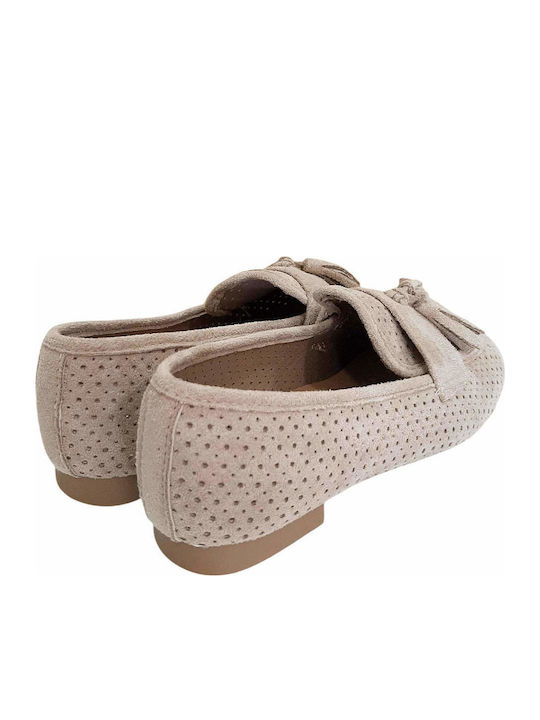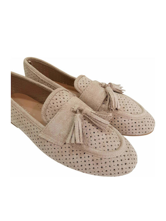 Γυναικεία loafers από suede με διάτρητο επάνω μέρος και διακοσμητικές φούντες στο μπροστινό τμήμα. Το suede υλικό παρουσιάζει ομοιόμορφη υφή και σταθερή δομή, ενώ οι μικρές διάτρητες λεπτομέρειες κατανέμονται ισομερώς σε όλη την επιφάνεια, προσδίδοντας ελαφριά και ισορροπημένη εικόνα στο παπούτσι. Η φόρμα είναι κλασική loafer, με ελαφρώς στρογγυλεμένο μπροστινό μέρος και καθαρές ραφές περιμετρικά. Η σόλα είναι χαμηλή και επίπεδη, με σωστή ευθυγράμμιση και σταθερή επαφή με το έδαφος.