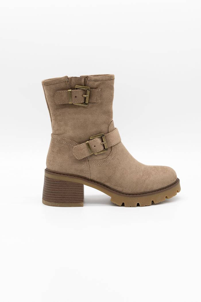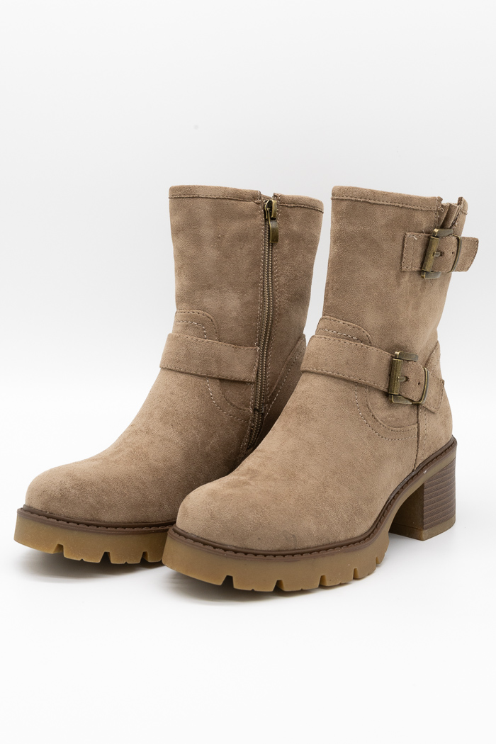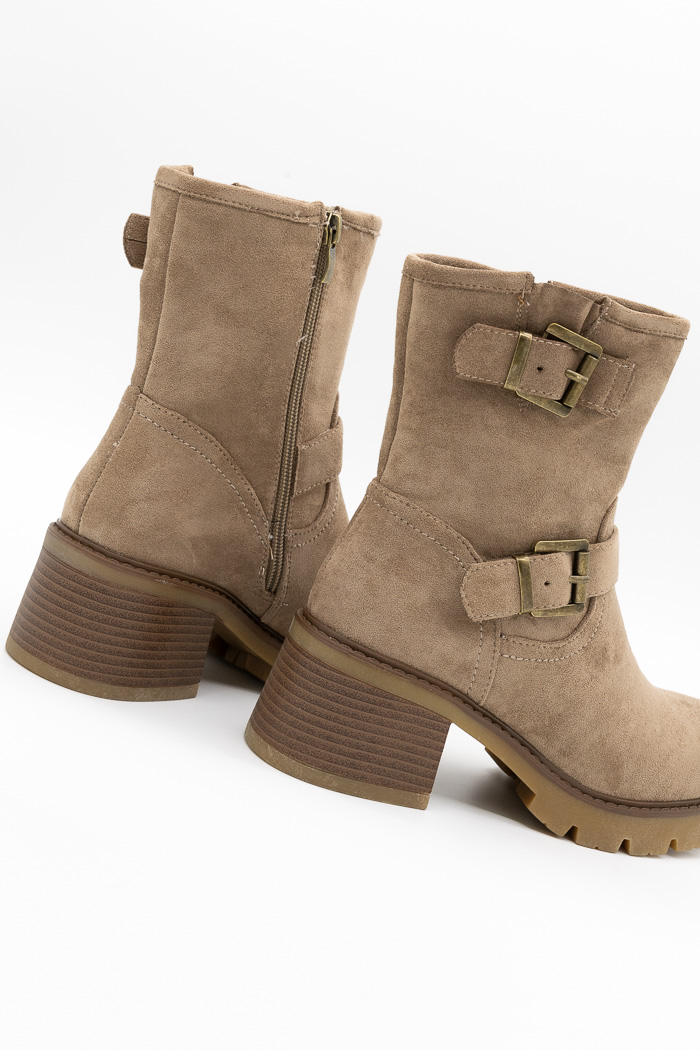 • Suede μποτάκια με τετράγωνο τακούνι, φιάπα και διπλές διακοσμητικές αγκράφες. Κομψό σχέδιο με σταθερό πάτημα και προσεγμένες λεπτομέρειες.•Ύψος τακουνιού 6cm.•Ύψος φιάπας 2,5cm.