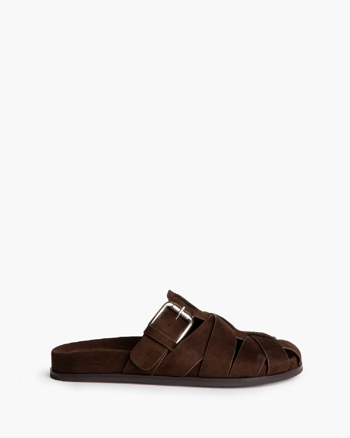 Φλατ σανδάλι, τύπου τσόκαρο. Φαρδύ λουράκι με λεπτομέρεια αγκράφα. Εργονομικός πάτος. Ύψος σόλας 3 cm.
