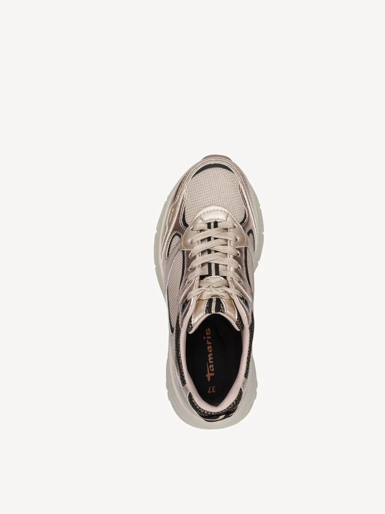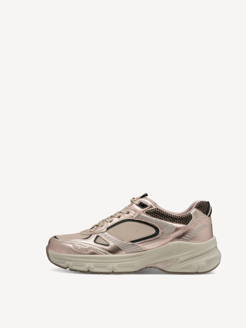 Ζήσε τον αληθινό συνδυασμό άνεσης και στιλ με τα Tamaris Sneaker Low – ιδανικά για καθημερινές στιγμές, βόλτες ή workout. Φόρεσε το ανατομικό αποσπώμενο πάτο που φροντίζει τα πόδια σου, νιώσε σιγουριά με την παχιά δομημένη σόλα και απόλαυσε αβίαστα το μοντέρνο αθλητικό look. Η διακριτική λάμψη από μεταλλικές λεπτομέρειες και τα mesh στοιχεία προσφέρουν ενέργεια, φρεσκάδα και μοναδικό χαρακτήρα σε κάθε εμφάνιση.