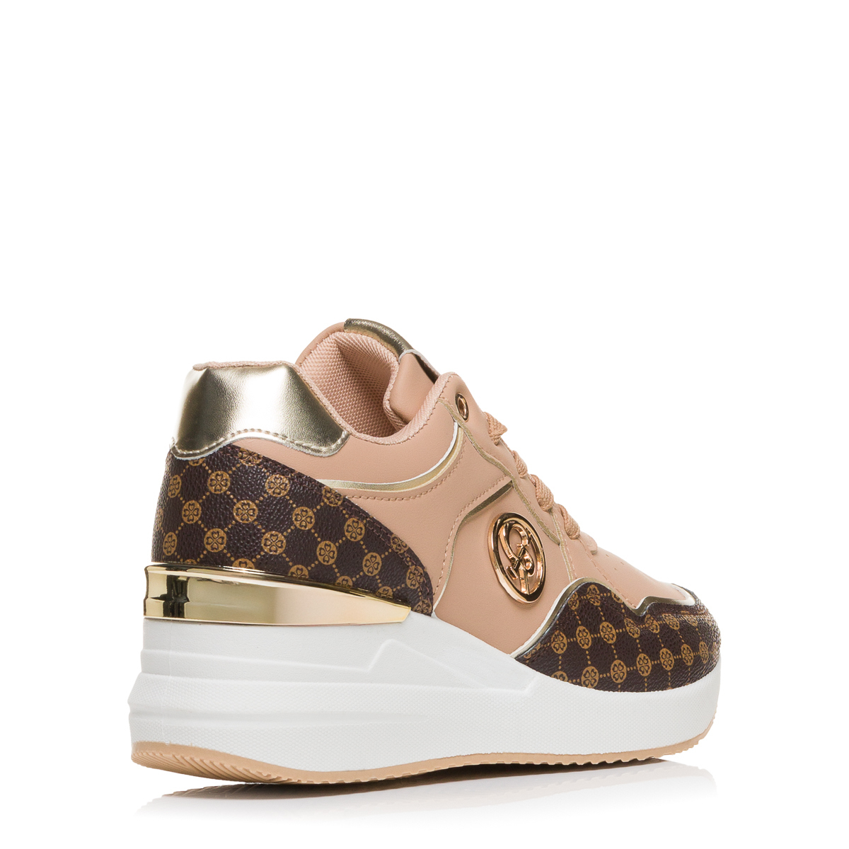Αυτό το sneaker συνδυάζει urban χαρακτήρα με πολυτελείς λεπτομέρειες. Είναι κατασκευασμένο από συνθετικό δέρμα με χρυσές μεταλλικές πινελιές και διακριτικό μοτίβο στο πλάι. Διαθέτει χοντρή λευκή σόλα που προσφέρει ύψος και άνεση. Το μεταλλικό logo στη μέση του παπουτσιού ολοκληρώνει το σχέδιο με κομψότητα.